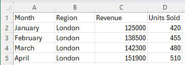 So writing our import as =IMPORTCSV(“C:\Users\maxhi\Documents\monthly-sales.csv”), brings all the data in immediately.