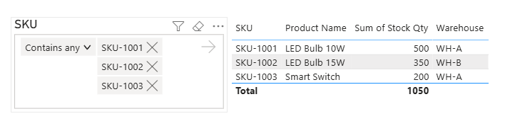 Users can paste SKU codes or invoice numbers copied from Excel directly into the Power BI input slicer to instantly filter reports.