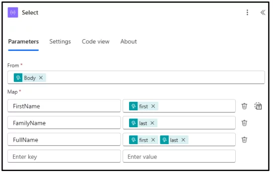 Rename fields (e.g., first → FirstName)