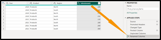 Let’s unpivot the table to revert it to the original structure before we pivoted the column headers of the region and sales amount.