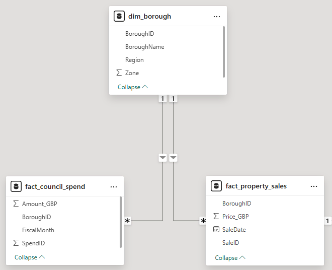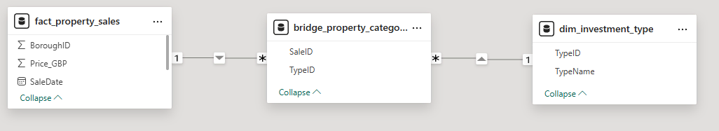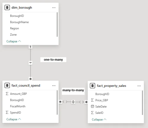 If we move things around a little, and connect dim_borough to fact_council_spend, then connect that up to fact_property_sales we see a many-to-many relationship.