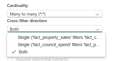 Power BI creates this because there is simply no shared lookup table controlling how the data between them connects. Instead, Power BI is trying to match any spending records to property sales, which are not unique – and that’s how we get many-to-many.