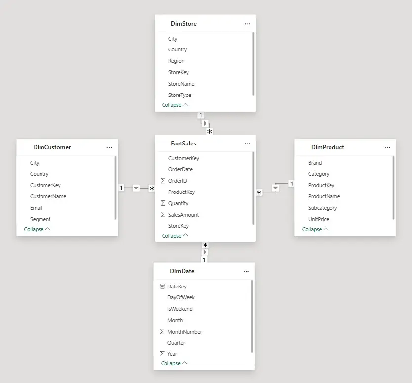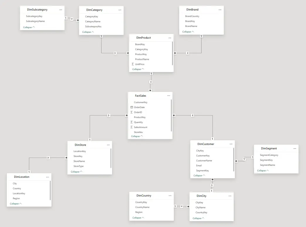 Each dimension connects directly to FactSales. Customer details, product categories, store information, and date table each sit in their own denormalised table, making the model fast, tidy, and easy to understand.