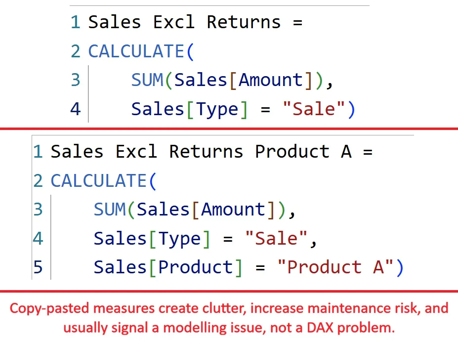 - Tiny variations of the same calculation: Total Sales, Total Sales (Excl Tax), Total Sales (Excl Returns). Multiple similar measures usually mean the model structure needs improvement.