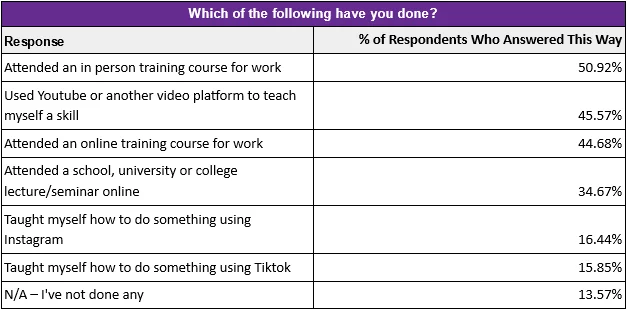 Amongst the 16 to 24s, just under a third have taught themselves a new skill using Instagram, while an impressive 44% have done the same thing using Tiktok.