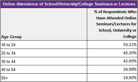Over half of those aged 16 to 24 have attended online lectures or seminars. The number drops through each age range.